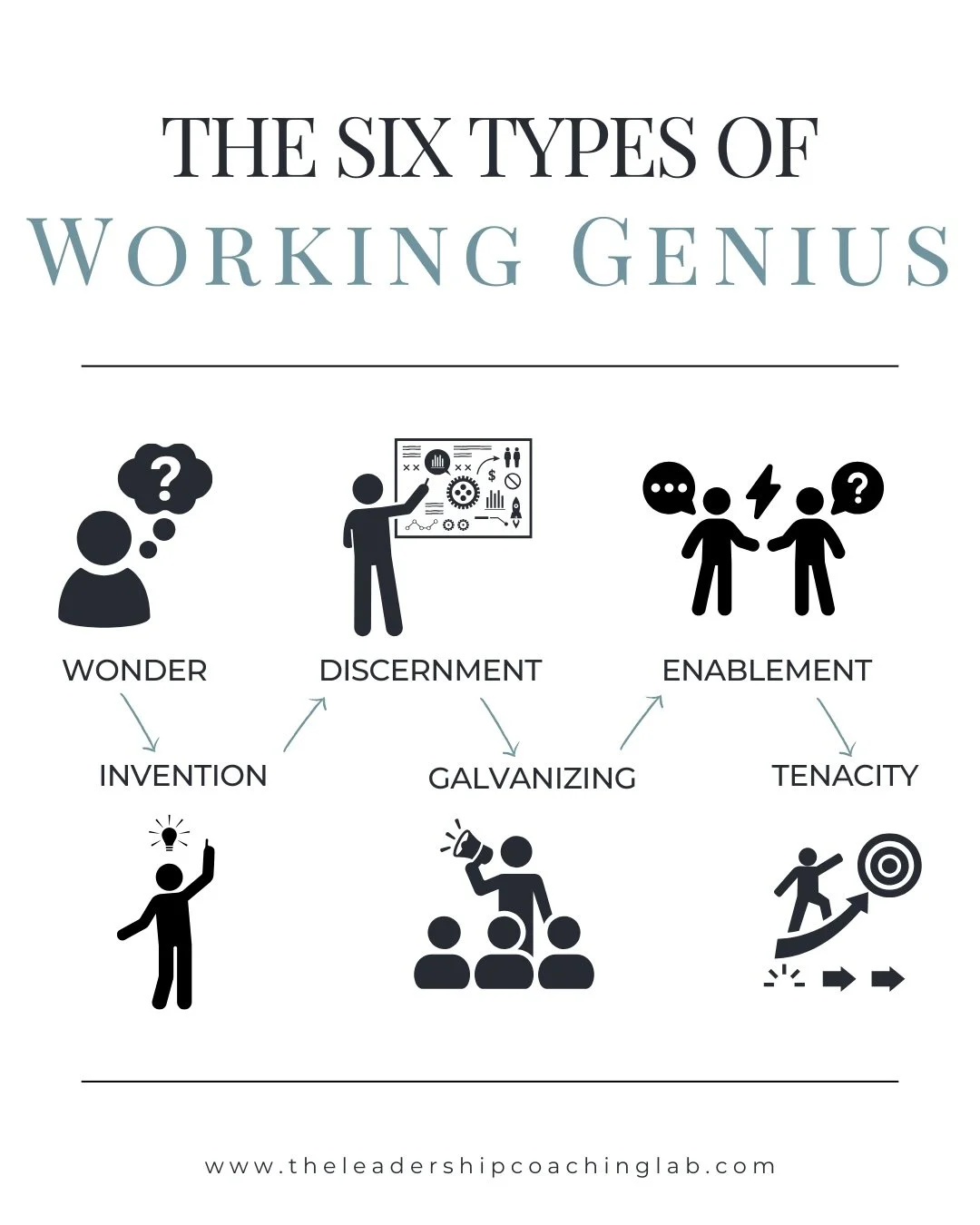 While these strategies offer broad ways to manage energy, it’s also helpful to have a structured framework for understanding how different types of work impact us individually. The Six Types of Working Genius model, developed by Patrick Lencioni and The Table Group, provides a practical tool for identifying the types of work that naturally energize us and those that drain us.